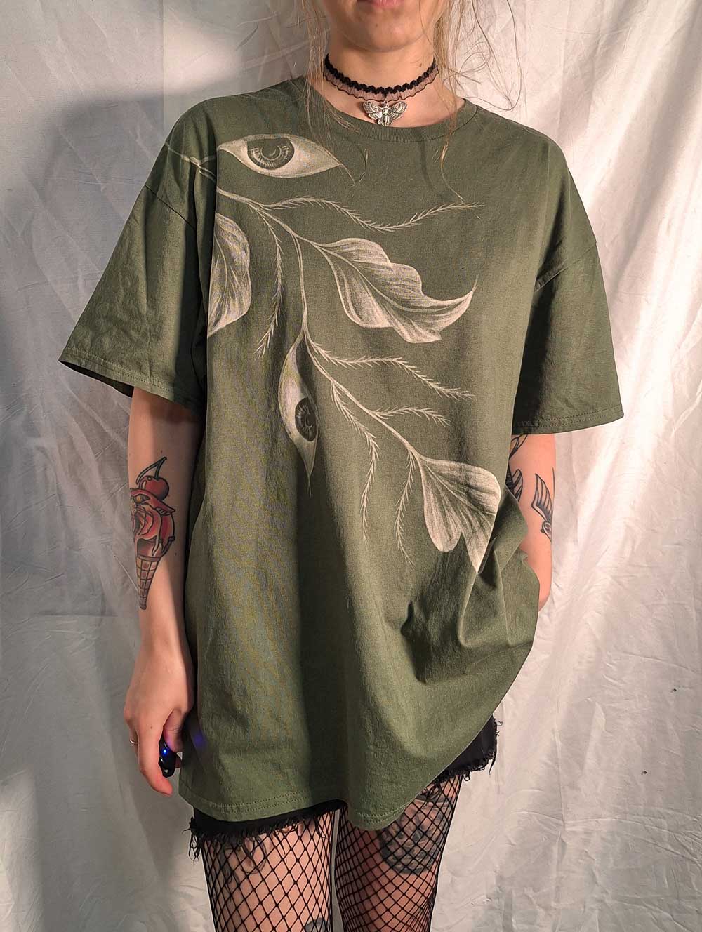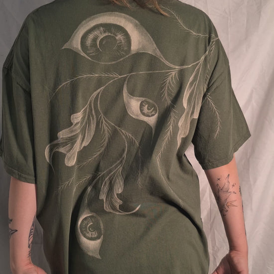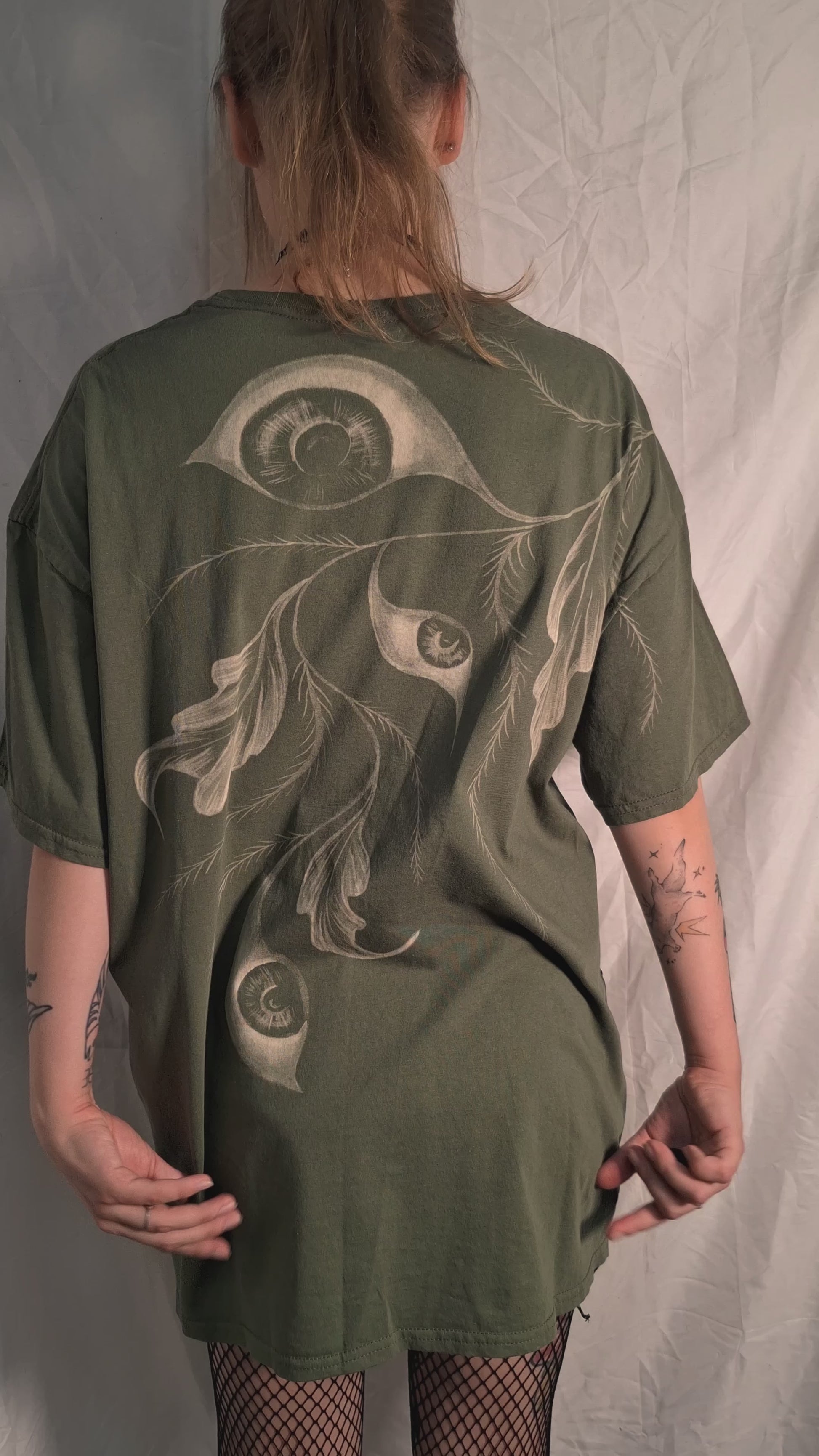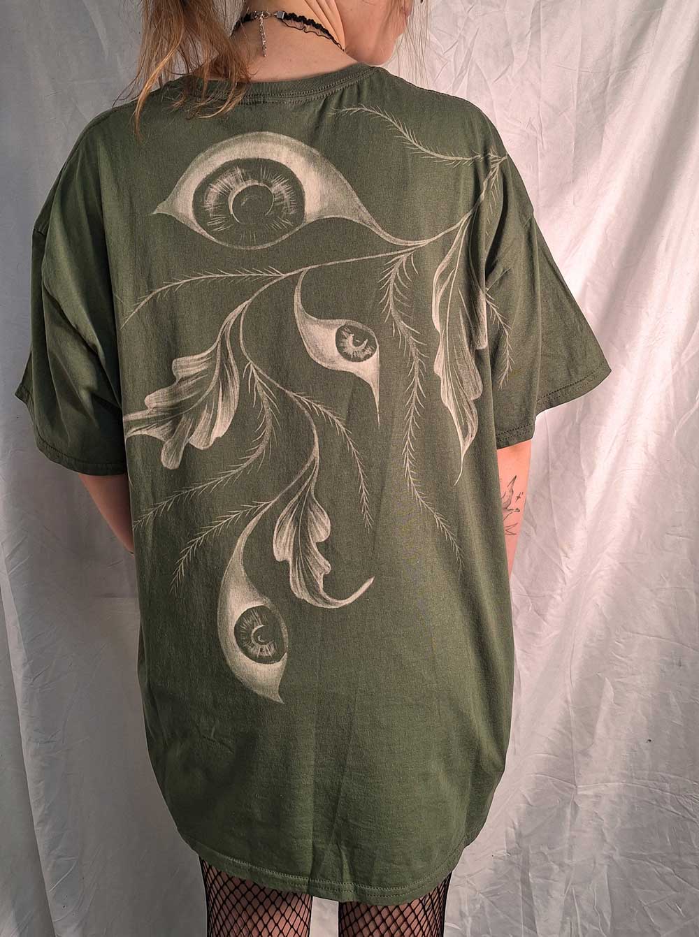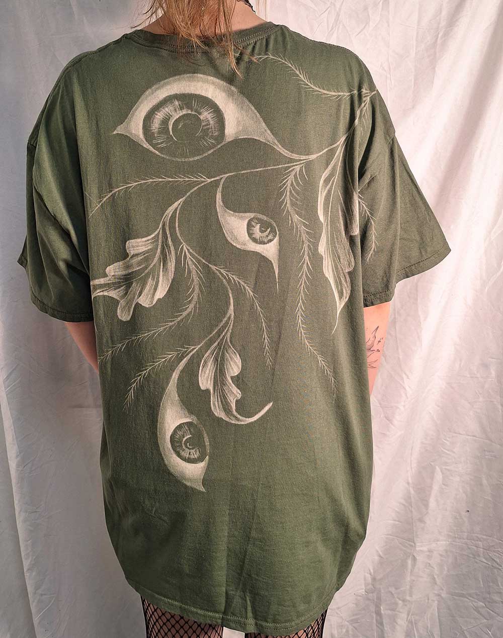 Each shirt is individually painted by hand, making every piece a completely unique creation. While the overall style and flow will remain consistent, no two shirts are exactly alike—the placement, shape, and motion of the eyes and foliage shift organically with each version. You’re not just wearing a shirt—you’re wearing a one-of-a-kind forest spirit.